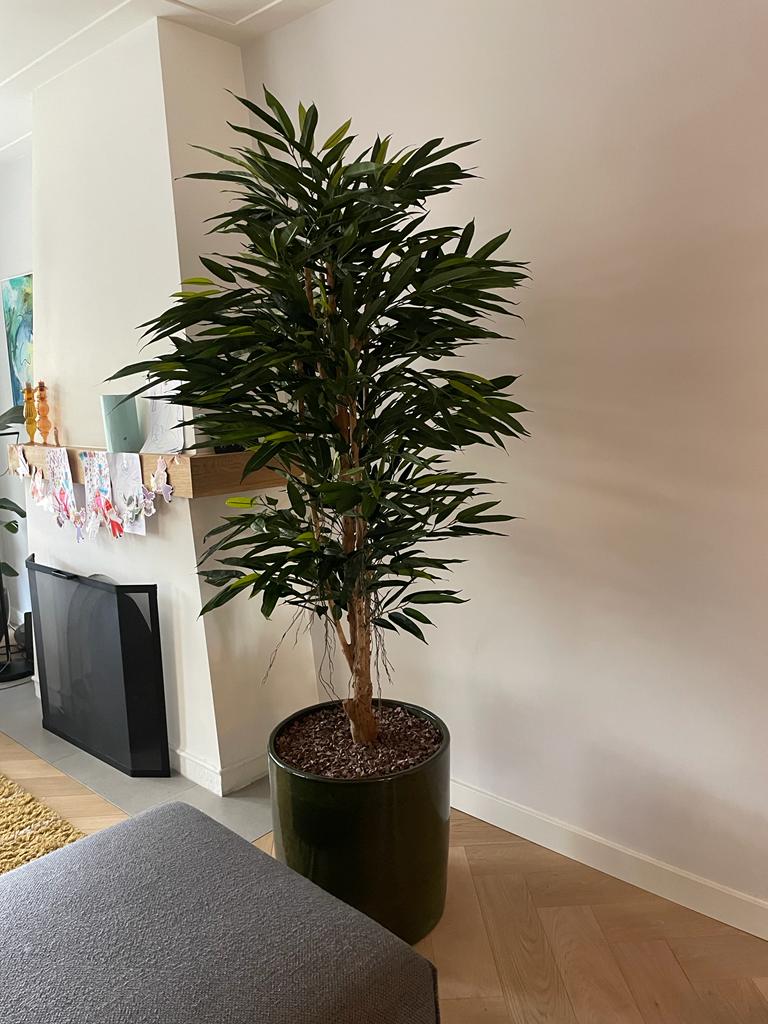 Ficus Longifolia is een van de vele varianten van de ficus familie. De plant is te herkennen aan zijn sierlijke bladeren die een beetje naar beneden hangen. Deze boom, want het is officieel geen plant meer, telt 924 bladeren. Daarnaast heeft deze vijgenboom een echte houten stam en verschillende kleuren bladeren. Hierdoor heeft de boom een echte premium look en kwaliteit. Met zijn hoogte van bijna 1,80 meter en verschillende kleuren groen zal deze ficus niet snel over het hoofd gezien worden door uw gasten.