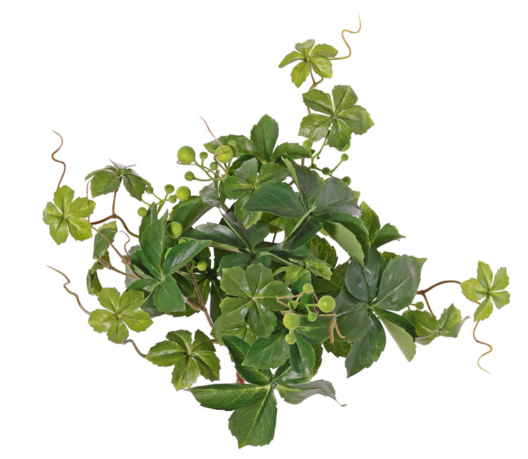 Deze Parthenocissus, ook wel Wingerdbush genoemd is een volle hangplant met bladeren die een beetje lijken op druivenbladeren. Normaal verkleuren de bladeren van de Wingerd het hele jaar door tot een bruine kleur, maar deze kunst variant zal altijd zijn mooie groene kleur behouden. De bladeren zelf variëren van groot tot klein en zijn niet van echt te onderscheiden.